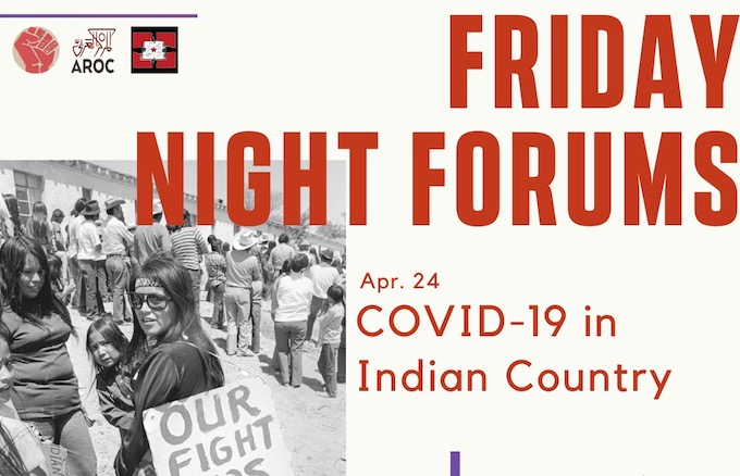 As part of the Friday Night Forums series CPE hosted in collaboration with The Red Nation and Arab Resource and Organizing Center, this webinar examines the impacts of COVID-19 on indigenous nations in the "United States" and "Canada" and how communities are responding. The webinar features presentations by Chief Jerry Daniels, Destiny Morris, and Janene Yazzie, and is moderated by Melanie Yazzie.