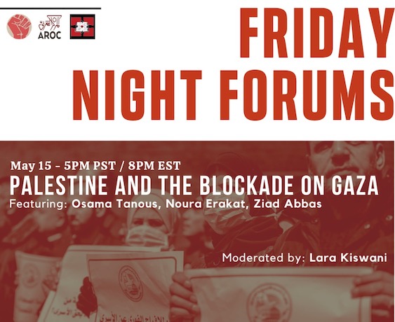 This fifth installment of the Friday Night Forums series CPE hosted in collaboration with The Red Nation and Arab Resource and Organizing Center examines the impacts of the blockade against Gaza during the COVID-19 pandemic. The webinar features presentations by Osama Tanous, Noura Erakat, and Ziad Abbas, and is moderated by Lara Kiswani.