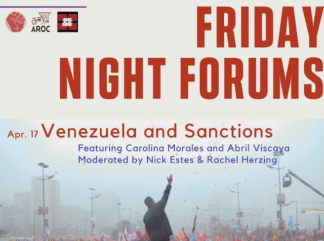 As part of the Friday Night Forums series CPE is hosting in collaboration with The Red Nation and Arab Resource and Organizing Center, this webinar examines how Venezuela is responding to the COVID-19 crisis even as it is struggling under sanctions and increasing aggression from the US. The webinar features presentations by Abril Viscaya and Carolina Morales and is moderated by Nick Estes and Rachel Herzing.